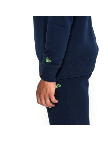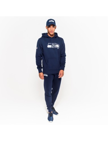 New Era Seattle Seahawks sweatshirt. After two consecutive Super Bowl appearances, the Seattle Seahawks will be ready to complete their treble in Super Bowl 50. Cheer on them in warmth and comfort in this genuine team hoodie, made of brushed, fitted fleece. Finished in navy blue throughout, it features a Seahawks logo screen-printed across the chest, a team-colored New Era flag above the left cuff, and a full-color NFL crest on the upper right sleeve. Includes front kangaroo pocket, drawstring hood and ribbed cuffs and hem.
